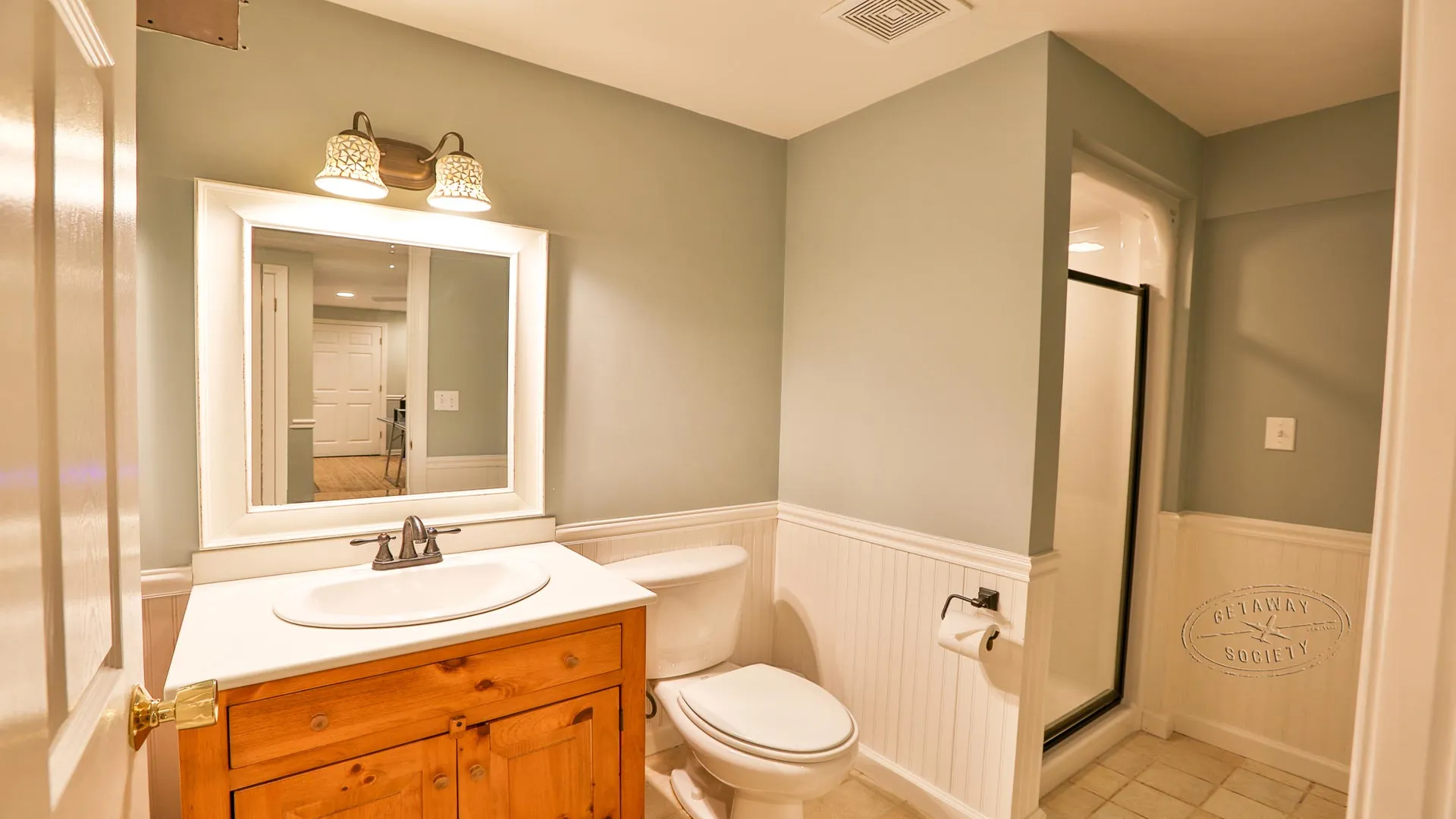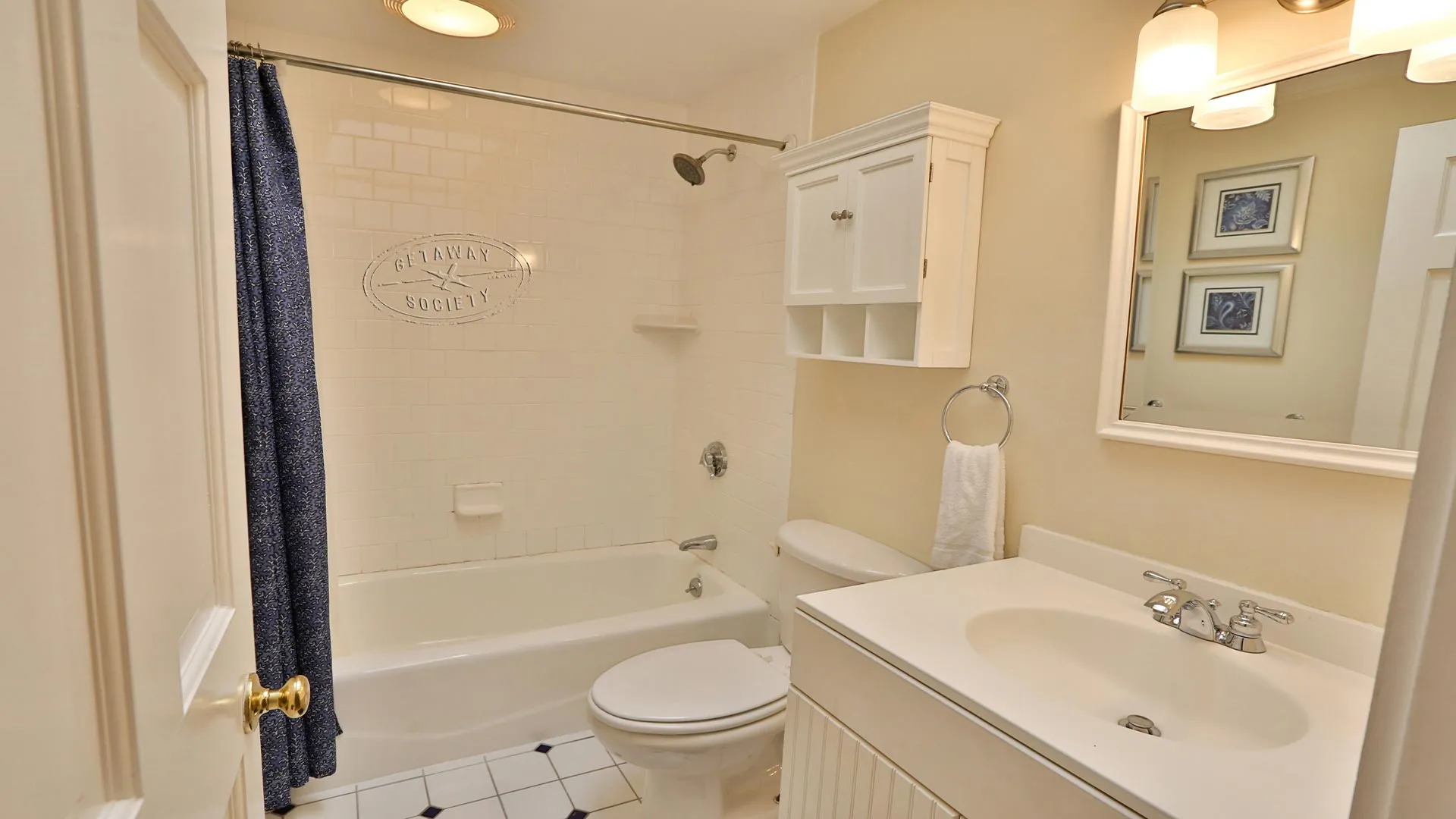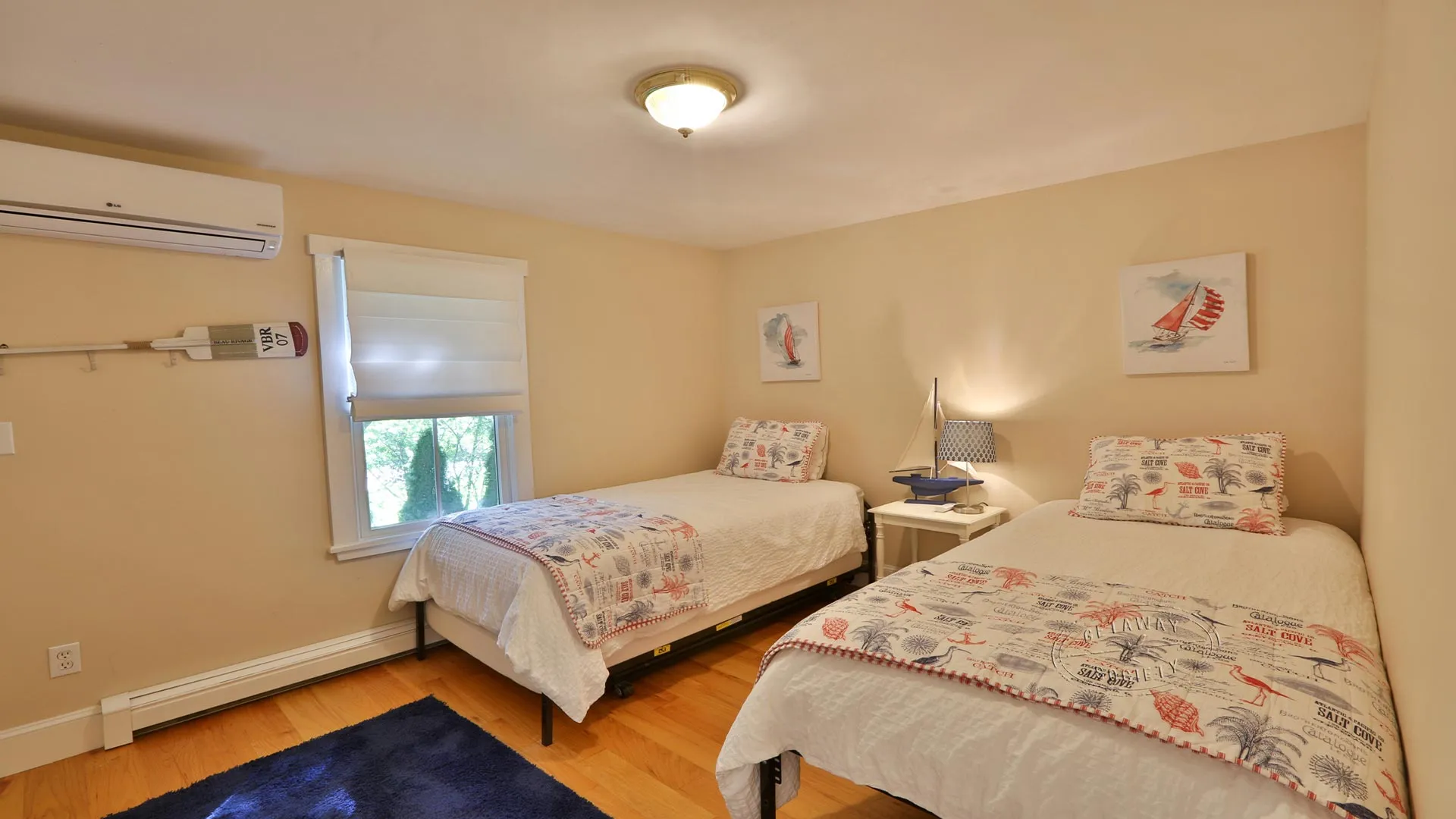 Upstairs, the spacious master en suite is decorated in warm blue tones and includes a 40-inch Samsung SmartTV, along with a separate attached room perfect as an office, sitting room, or nursery. The en suite bathroom features a beautiful mosaic-tiled shower. The first-floor bedroom boasts a queen bed, a 32-inch Samsung SmartTV, and a fully renovated full bathroom just outside the door, complete with a new vanity, new flooring, and a stunning floor-to-ceiling tiled shower. Two upstairs bedrooms each have two twin beds (one with a trundle) and share a full hallway bathroom. The twin beds can be converted into king beds, offering flexible sleeping arrangements.