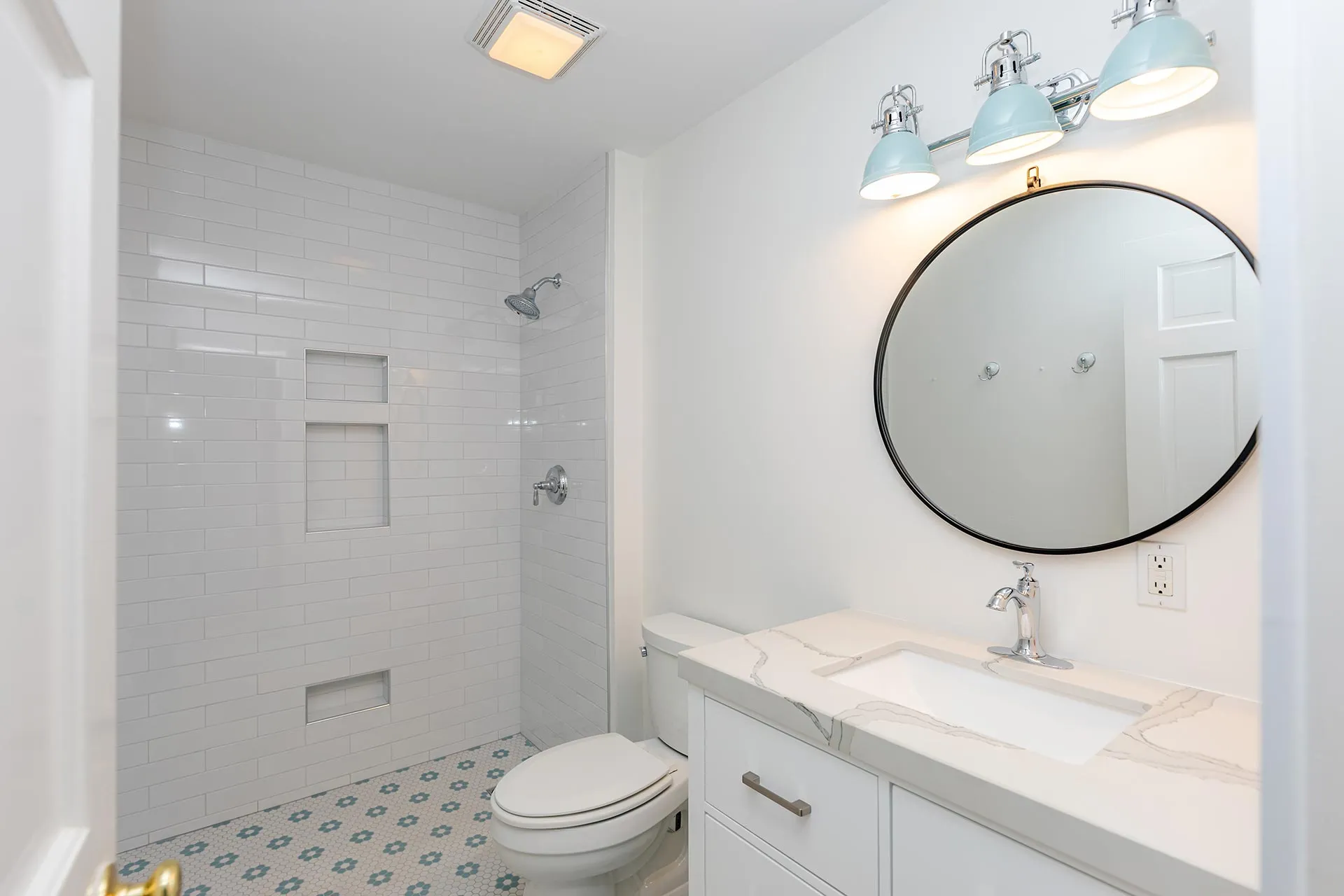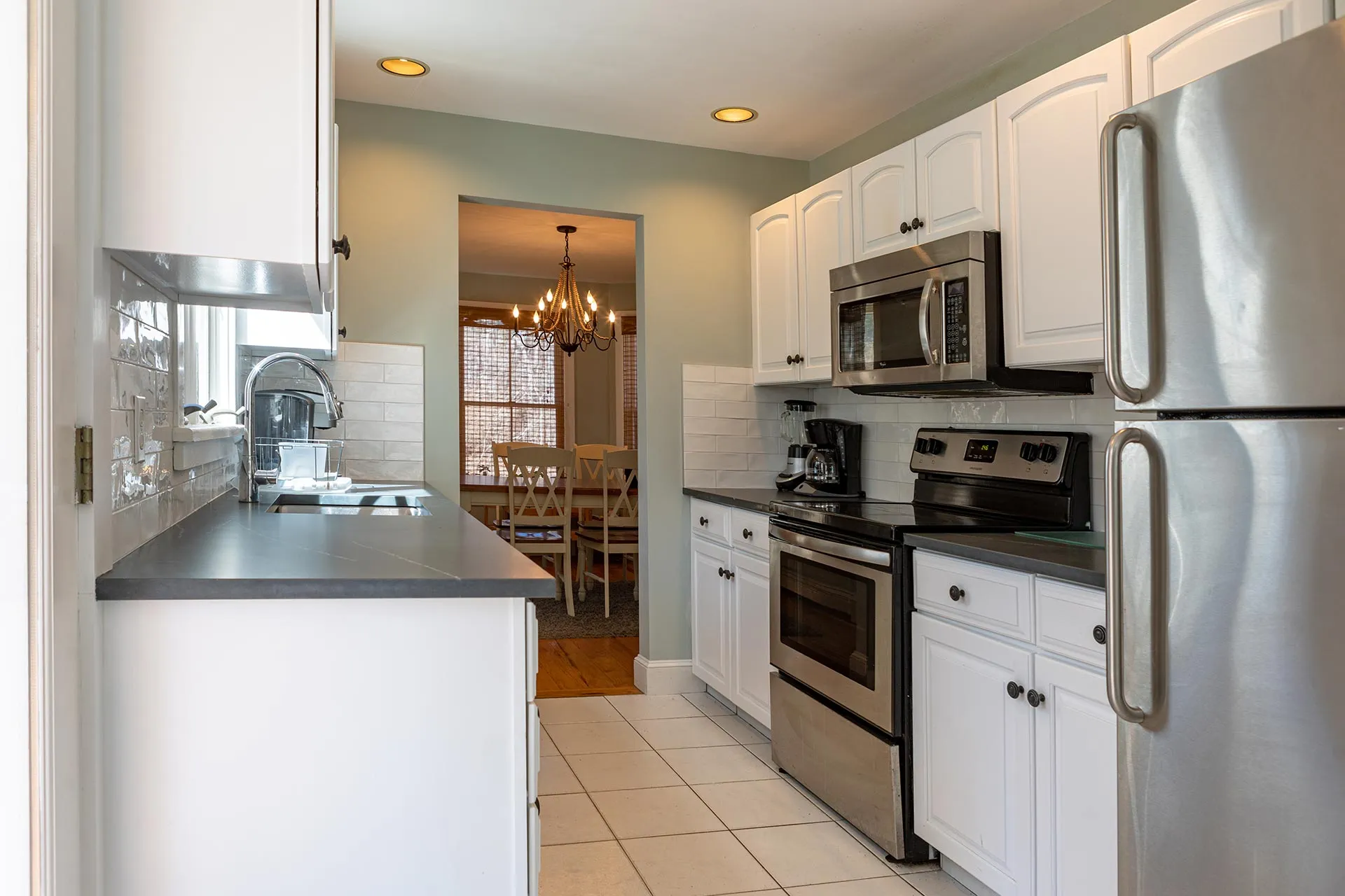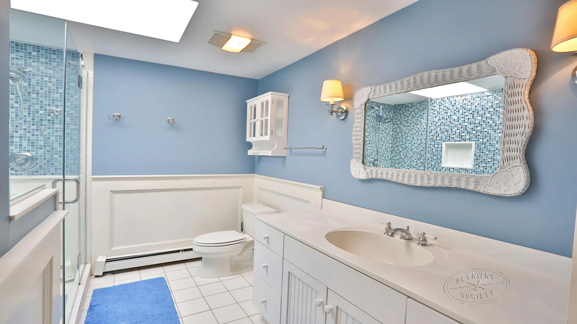Upstairs, the spacious master en suite is decorated in warm blue tones and includes a 40-inch Samsung SmartTV, along with a separate attached room perfect as an office, sitting room, or nursery. The en suite bathroom features a beautiful mosaic-tiled shower. The first-floor bedroom boasts a queen bed, a 32-inch Samsung SmartTV, and a fully renovated full bathroom just outside the door, complete with a new vanity, new flooring, and a stunning floor-to-ceiling tiled shower. Two upstairs bedrooms each have two twin beds (one with a trundle) and share a full hallway bathroom. The twin beds can be converted into king beds, offering flexible sleeping arrangements.