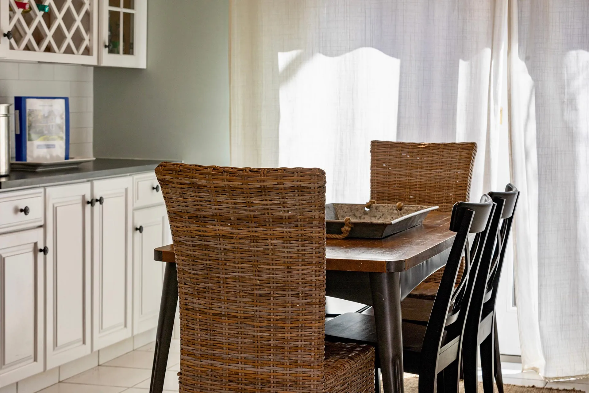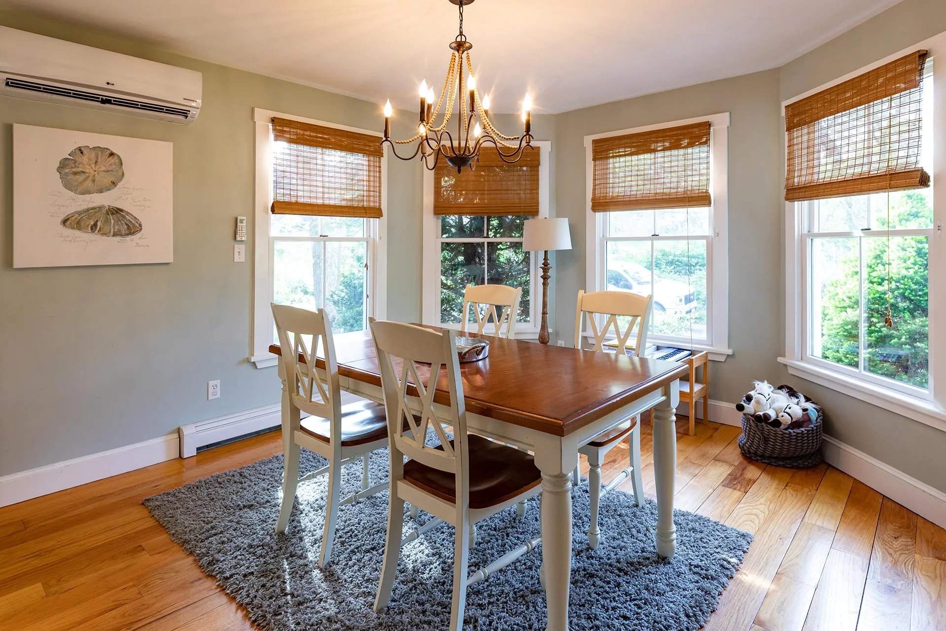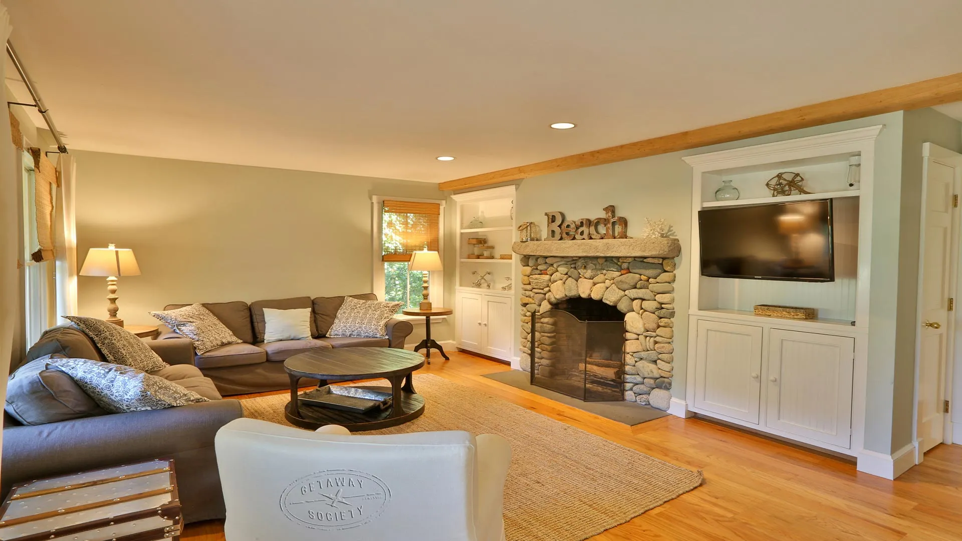 This air-conditioned home features an eat-in kitchen and a separate dining room that can accommodate up to 9 guests. The living room is accented by a 40-inch Samsung SmartTV and a charming beach stone fireplace, making it an inviting retreat after a day exploring the island.