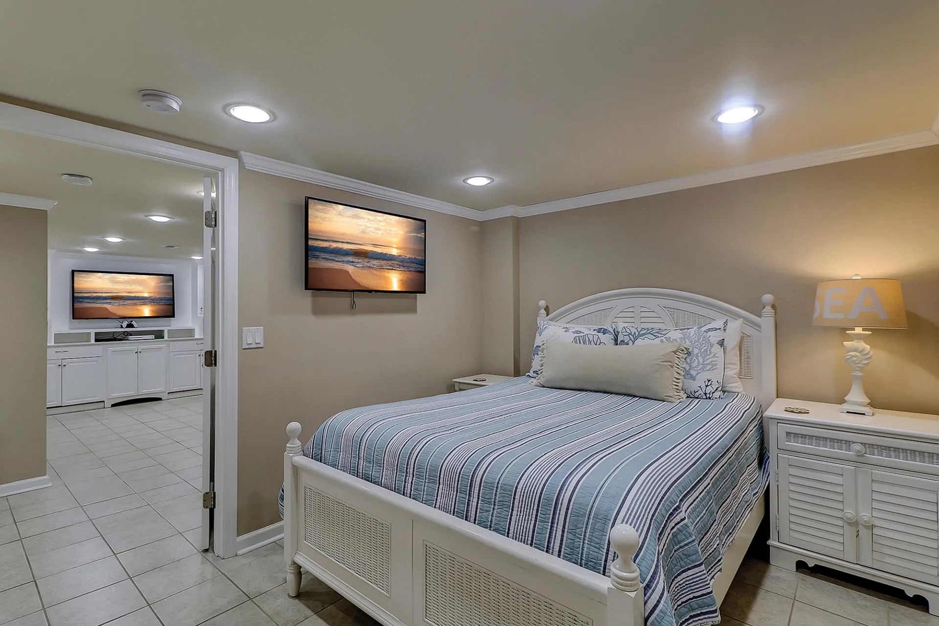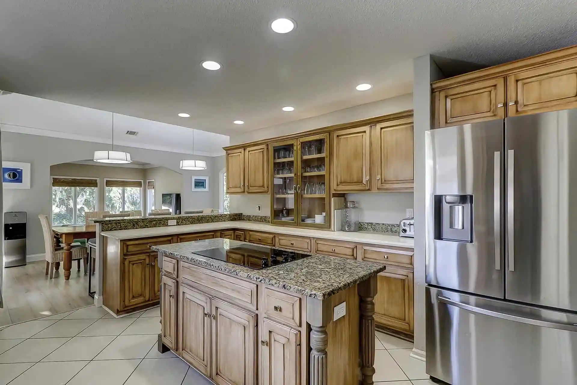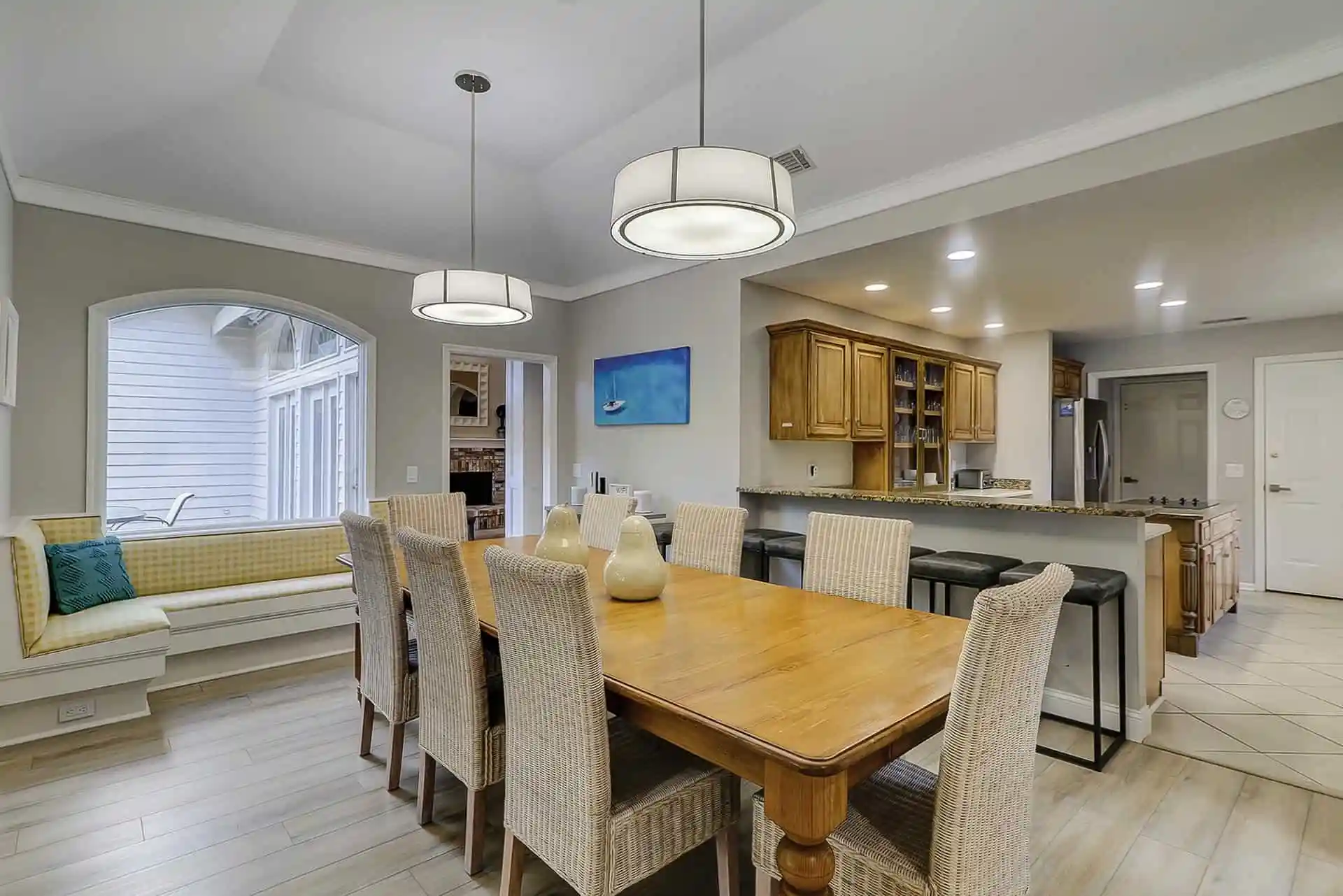 Upon entering, you’ll be greeted by an open floorplan designed for entertaining, with seamless flow between the kitchen, dining room, and living room. The spacious kitchen is perfect for meal prep, while multiple dining areas and a breakfast bar provide plenty of seating for both intimate and large gatherings. A sun-kissed Carolina Room offers breathtaking views of the pool and golf course, making it an ideal spot to relax with your morning coffee. The upper level boasts four bedrooms, while the lower level has three bedrooms, allowing large families or multiple families to spread out and unwind. Much of the home’s furniture is new, ensuring a fresh and comfortable stay.