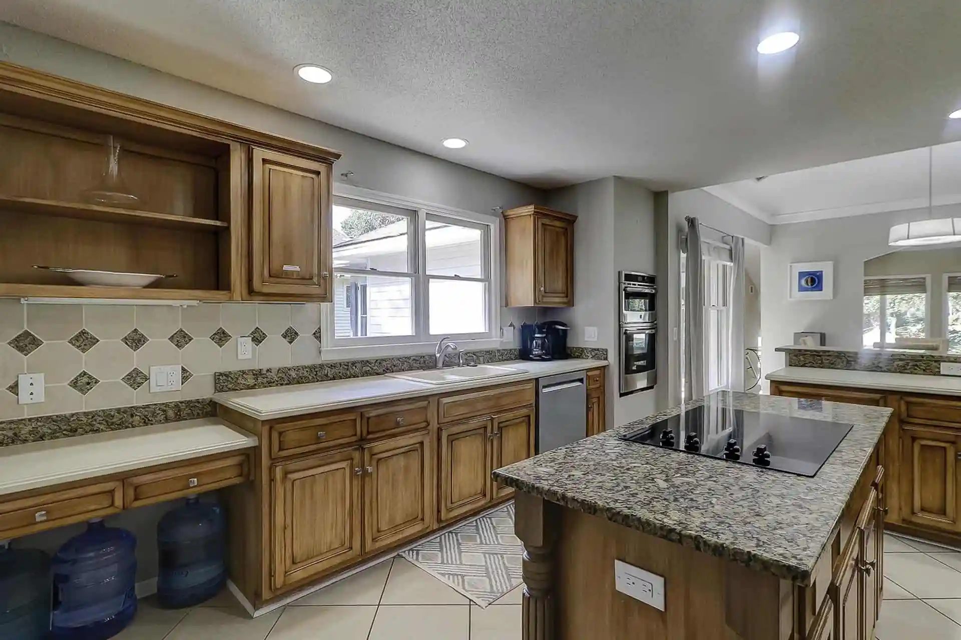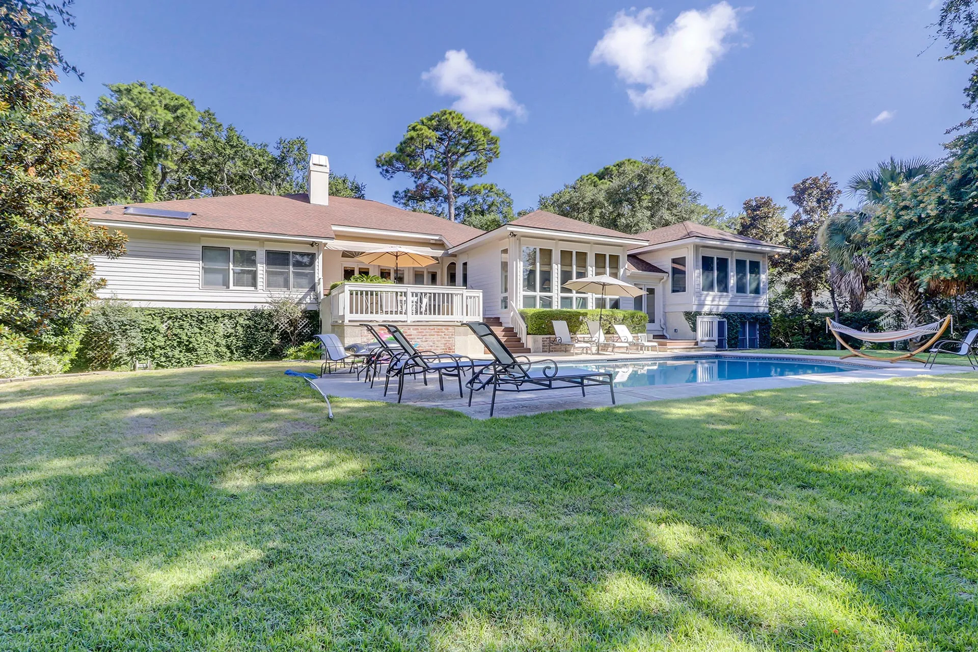 The backyard is a private resort! Overlooking the 15th hole of the Robert Trent Jones Golf Course, the oversized 25 ft x 45 ft pool is the perfect spot to soak up the sun. Lounge poolside, nap in the hammock as the sea breeze drifts through the trees, or gather around the fire pit at night as the illuminated pool and nightscaping transport you to another world.