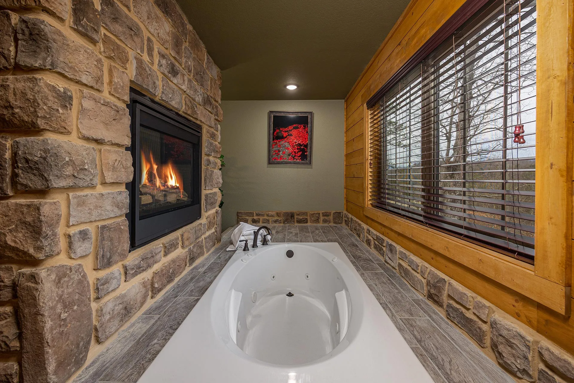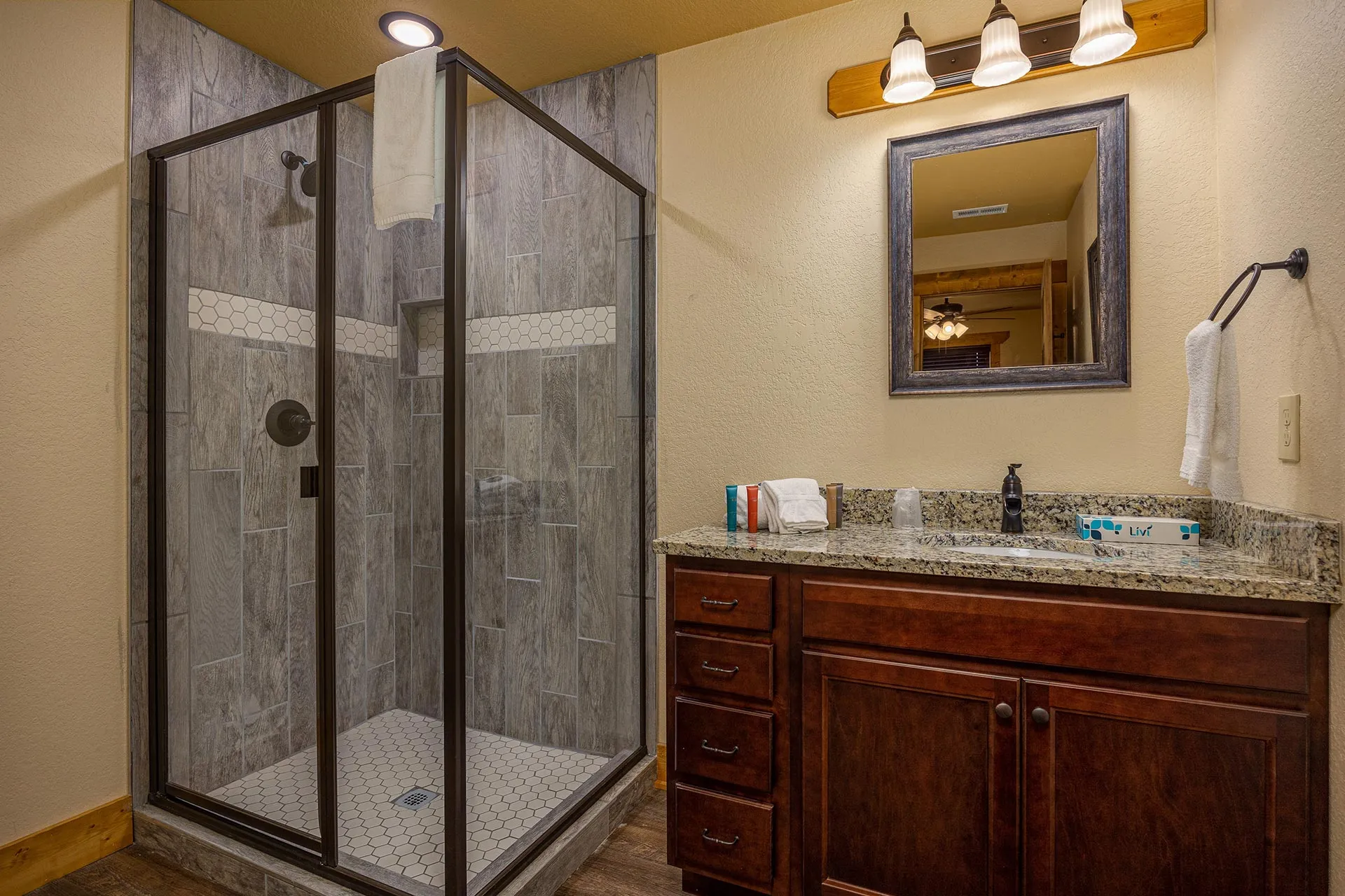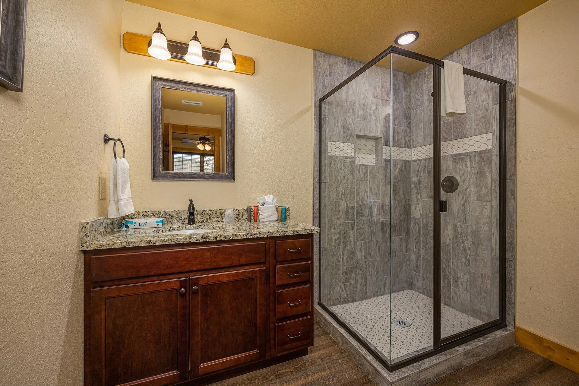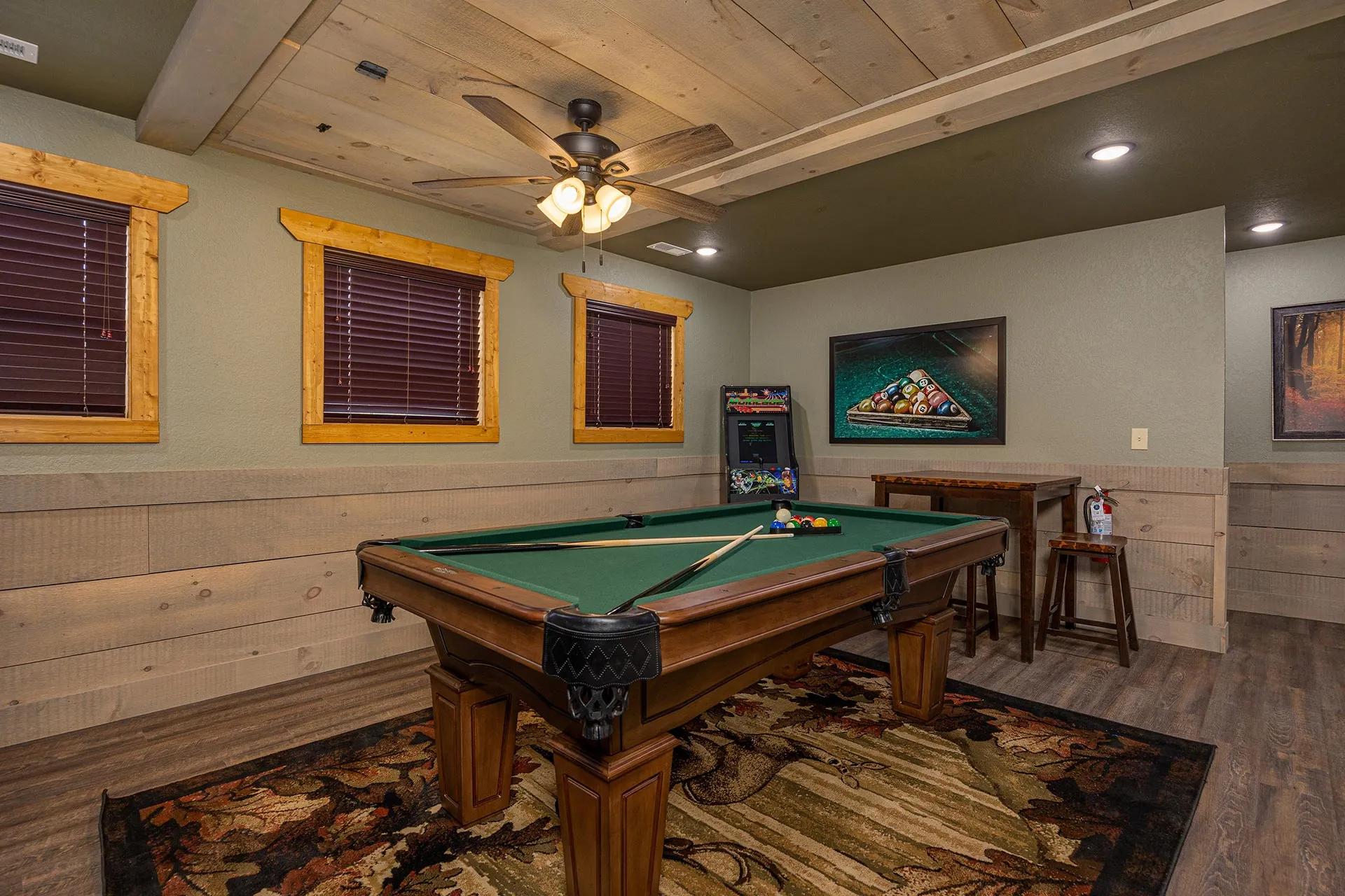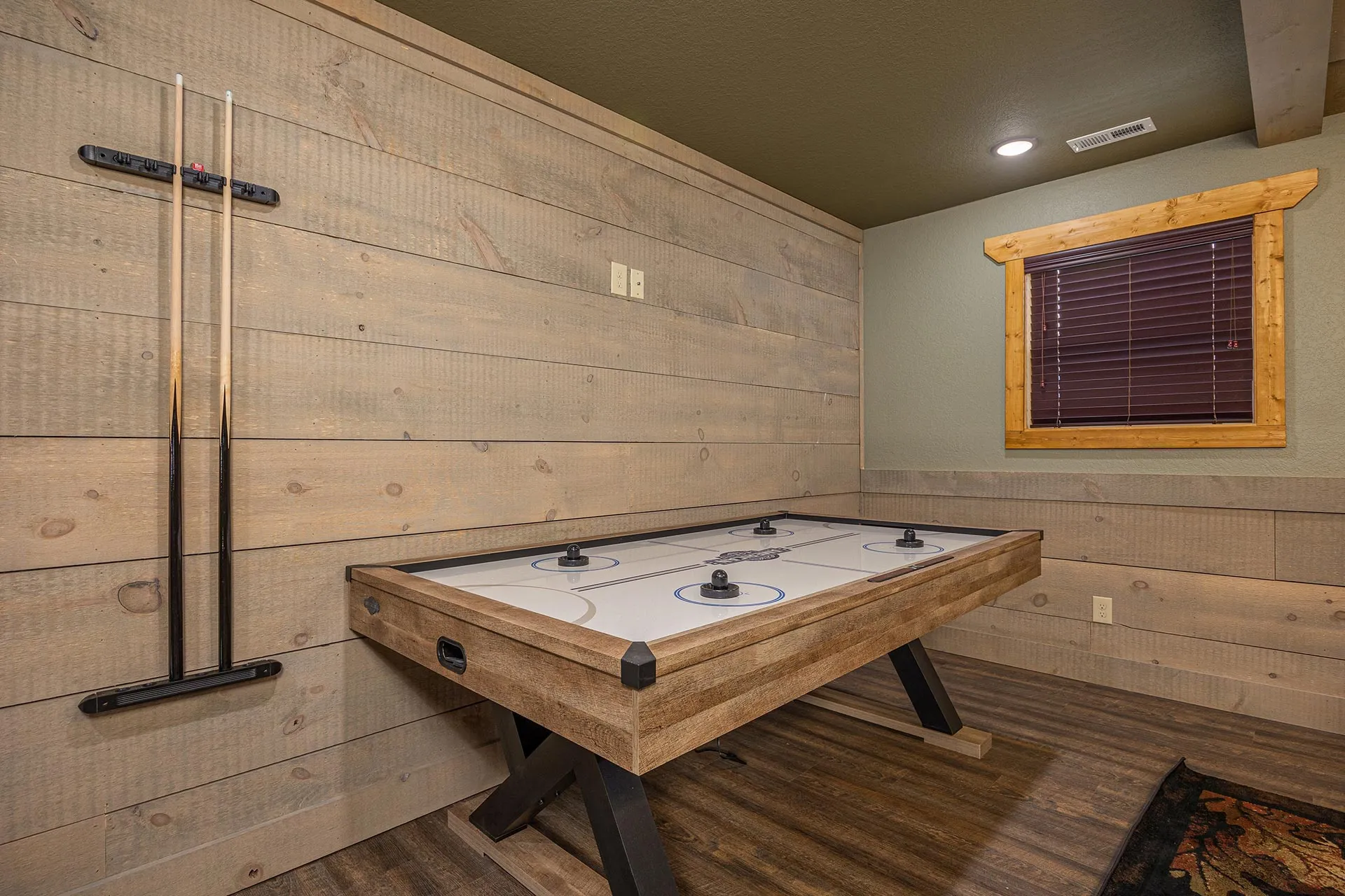 For those seeking cabins in Gatlinburg, TN, this newly built 4-bedroom, 4-full bathroom, and 2-half bathroom cabin is designed to impress. The modern furnishings, spacious layout, and entertainment-packed game room—including a multi-game arcade machine, pool table, and air hockey—ensure there’s something for everyone to enjoy. The great room, featuring a double-sided stone fireplace, large smart TV, and high vaulted ceiling, is the perfect place to gather and relax.